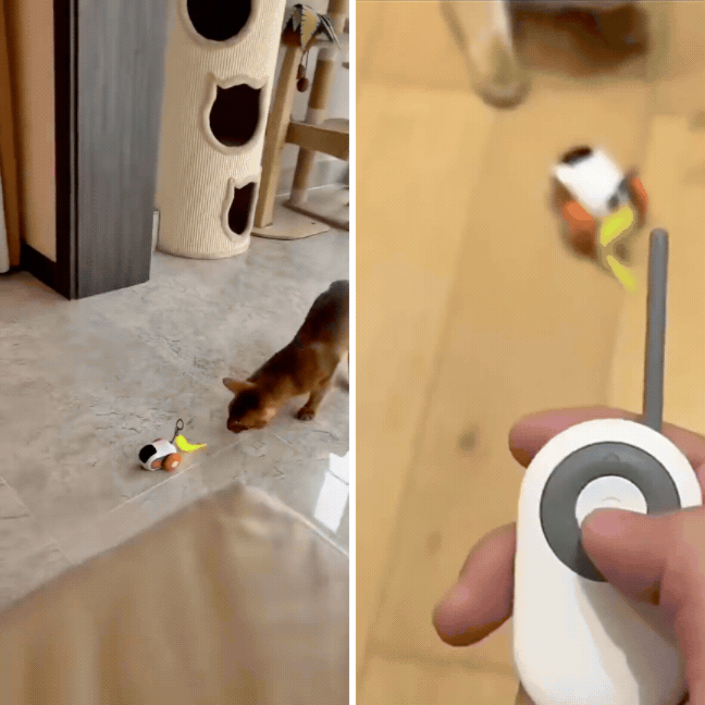 2️⃣ Remote Control Mode: Put the fun in your hands; the included four directions remote control allows you to move the interactive pet toy back and forth with just the press of a button, increasing the fun of interacting with your cat.